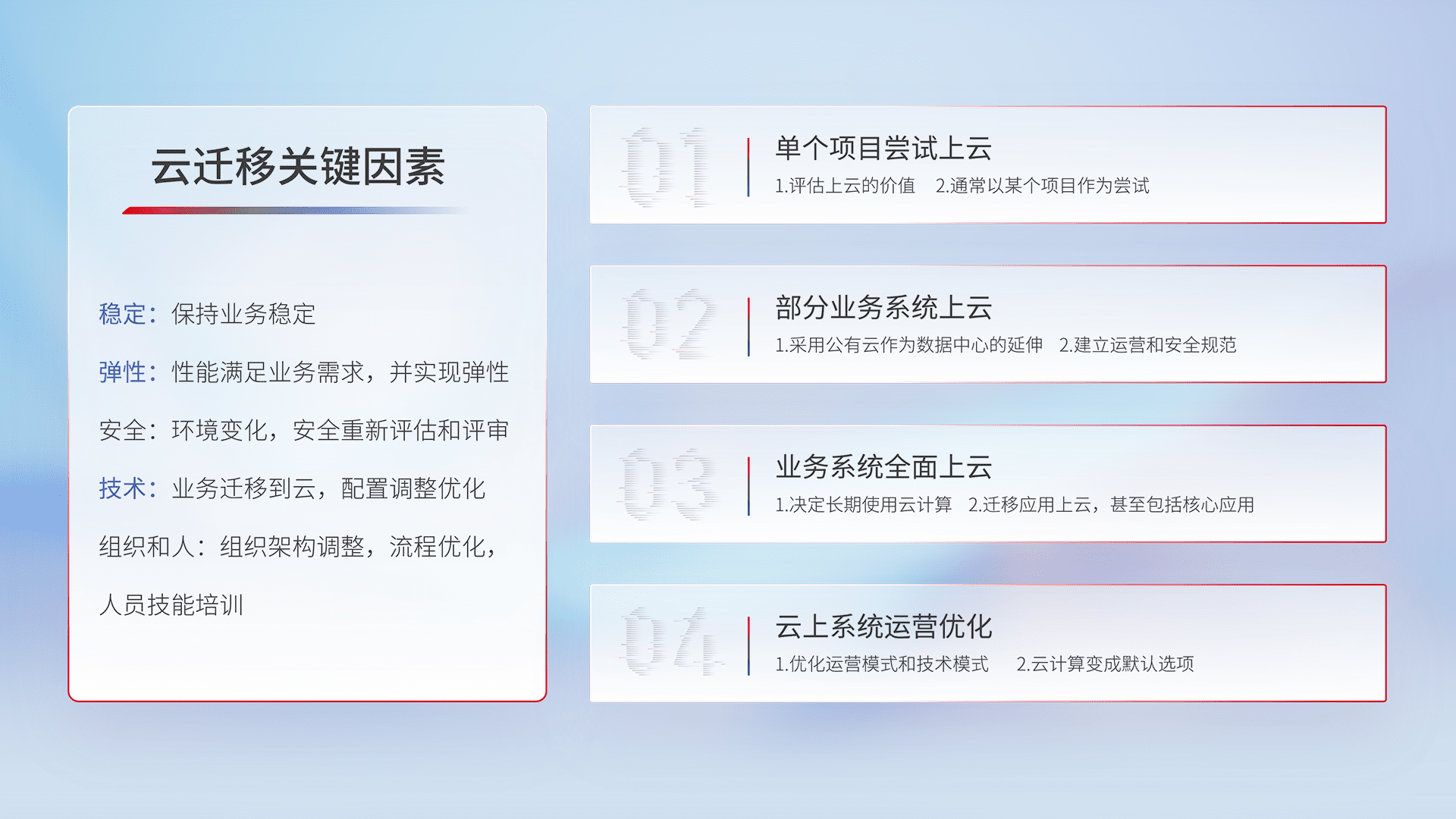 结合实际业务,,从规划设计、、、、云平台选型、、、云原生改造、、数据迁移、、、集成交付,,,,迁移全过程为客户识别最佳上云路径,,做好风险识别管理,,,设计网络架构、、身份权限、、安全审计合规、、、操作审计、、、日志审计、、监控告警策略、、多站点容灾设计等,,,对云上基础设施进行整体规划,,,提升IT治理水平,,,,以满足弹性、、、高可用、、高性能的需求。。。。