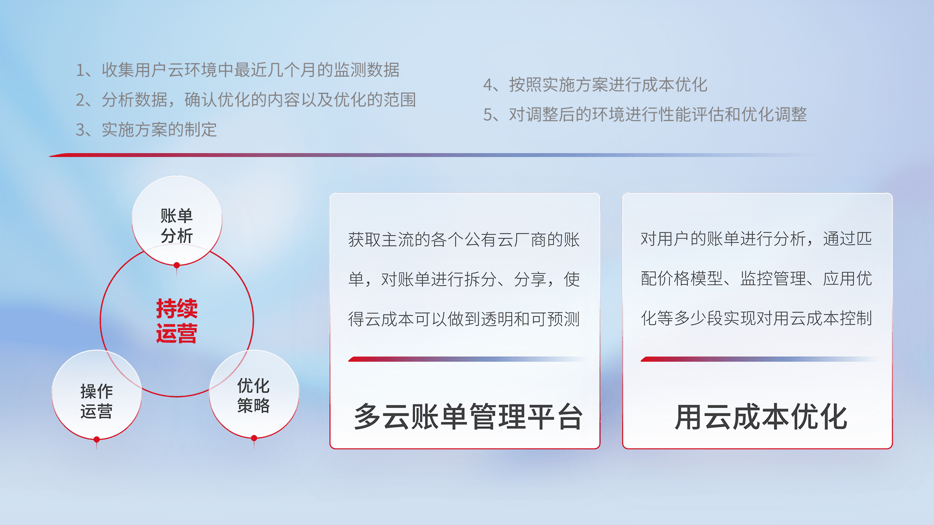 通过多云纳管,,以统一的资源数据模型把客户的云资源进行抽象和封装,,,,进而实现对多云资源的统一操作,,保障云资源管理的可靠性、、、稳定性与可用性。。量身定制化运维内容,,,配置、、开发运维、、、、补丁管理、、、备份、、监控、、、认证和访问管理、、、审计和日常巡检等,,,,保障在用云过程中的可靠度,,,稳定度以及高可用率。。。。