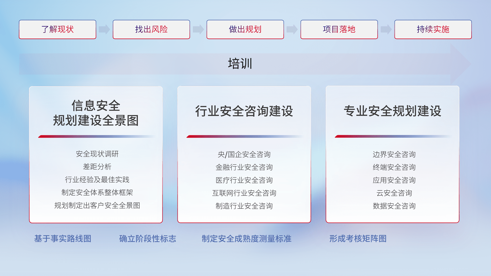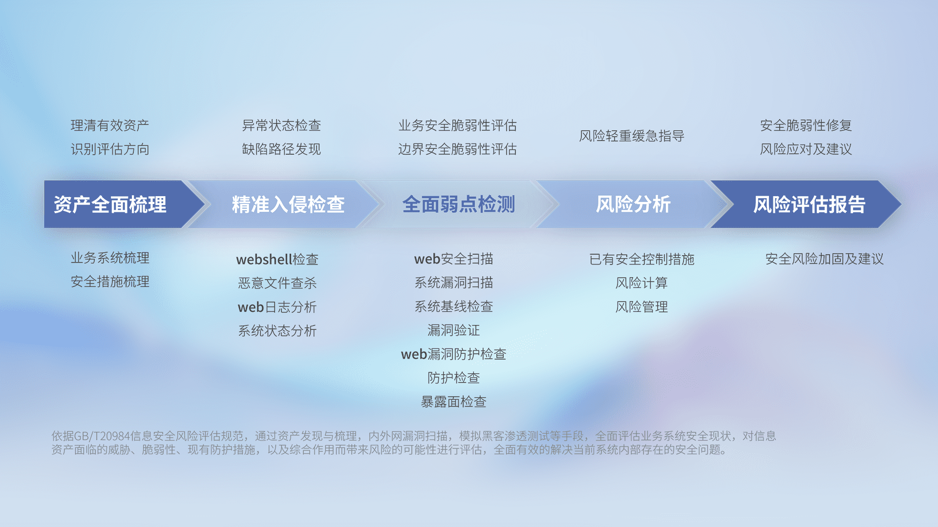 针对客户行业特性,,,以专业的安全服务+多厂商联合解决方案提供专属的一站式安全管理服务,,帮助客户全面感知网络空间威胁,,基于识别、、、、检测、、、分析、、防护、、、、监测、、、响应的服务理论模型,,,从方案咨询、、、集成交付、、评估验证、、、、优化加固、、、、运维运营,,,致力于为客户提供完整的闭环管理式安全服务。。。。以实战经验为客户打造高抵御风险的安全体系,,,帮助客户发现威胁、、对抗威胁、、、处置威胁,,不断积累安全对抗能力,,,持续保障数字化安全。。。。